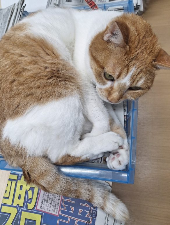 雑紙を作ってたら、雑紙を入れるかごに入って邪魔しにきたとら吉くん…。箱型のものはなんでも入るとら…。猫だなぁ…。